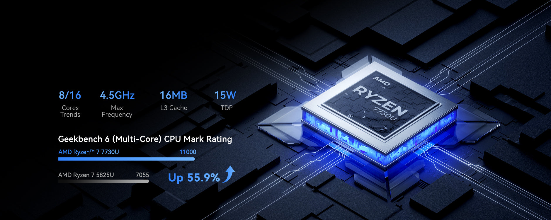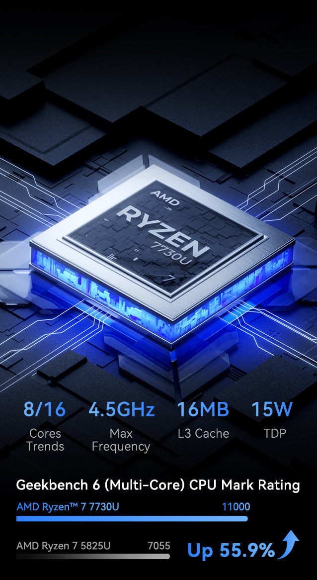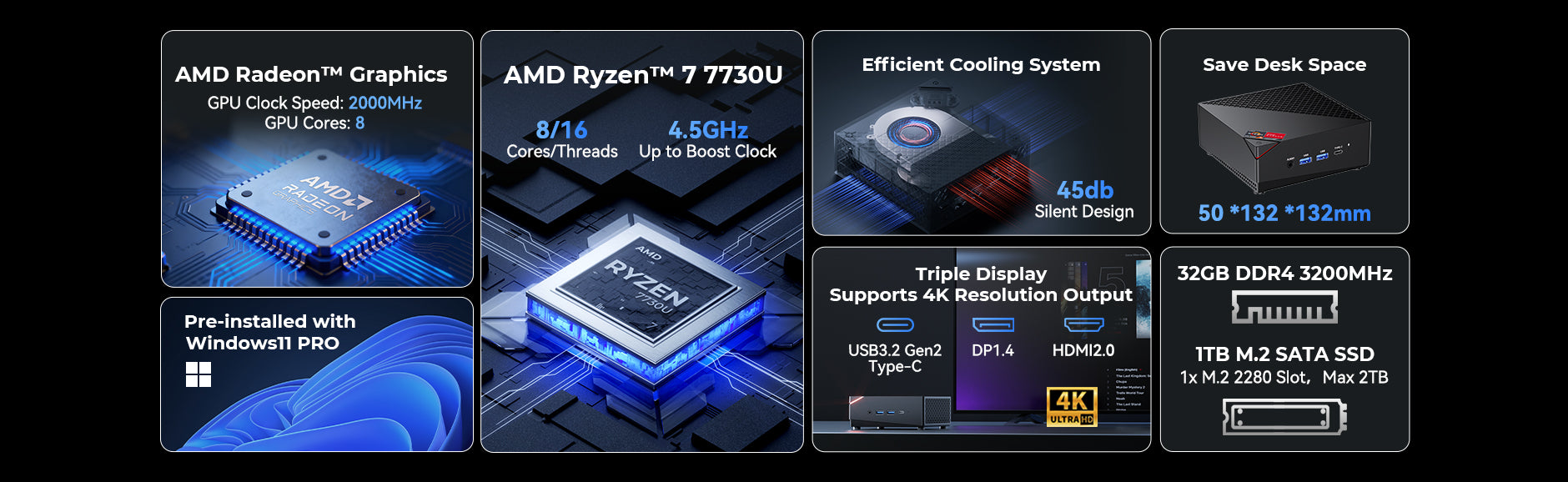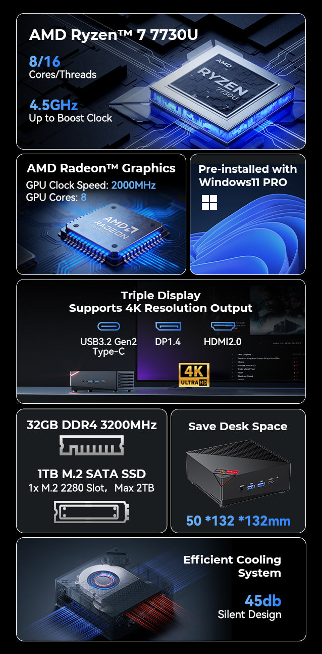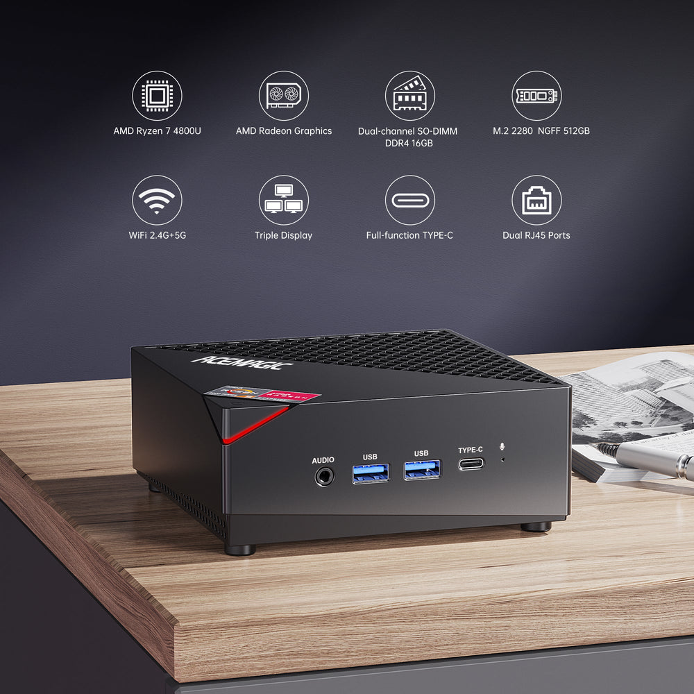 The ACEMAGIC AM06 Pro is a high-performance mini PC equipped with an AMD Ryzen 7 7730U/5700U/5825U processor. It is well-suited for gaming and comes with 32 GB of DDR4 RAM and a 1 TB SSD (expandable up to 2 TB). It supports triple 4K@60Hz video output via HDMI, USB-C, and DisplayPort, as well as dual Ethernet ports and Wi-Fi 6. It runs on Windows 11.